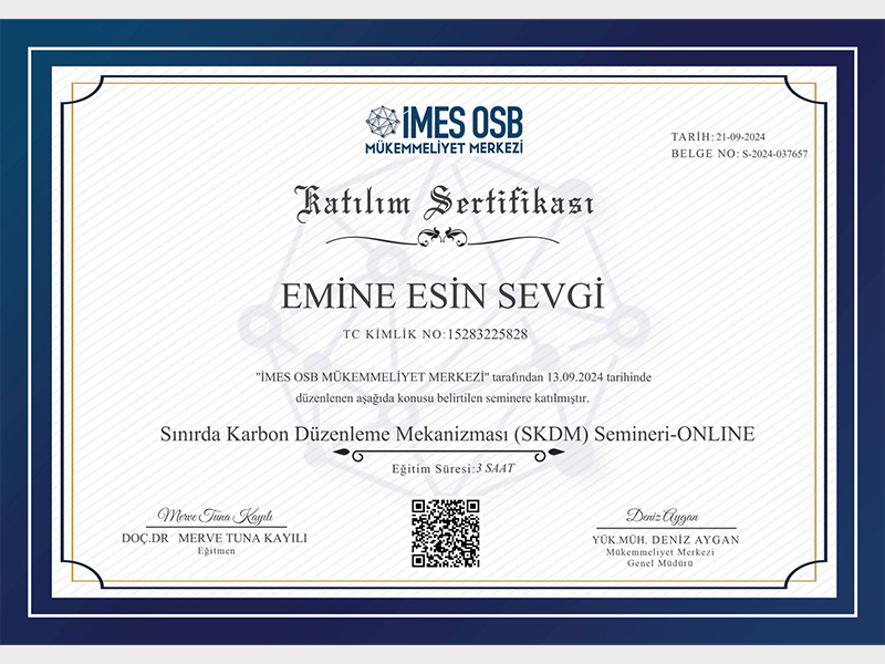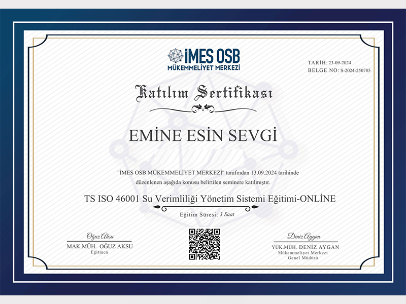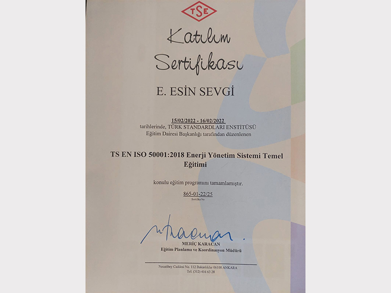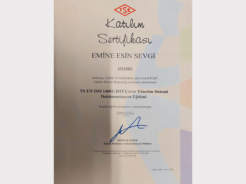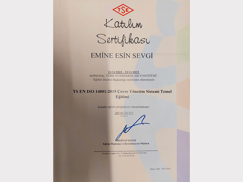 Çevreye duyarlı bir yaklaşım yalnızca uygulamalarla değil, aynı zamanda bilgi ve uzmanlıkla da pekiştirilir. Bu bilinçle, çevresel yönetim alanındaki uluslararası standartlar konusunda teorik ve pratik bilgi birikimimizi güçlendirdik. Ekibimiz, ISO 14064 ve ISO 14001 standartları kapsamında aldığı resmî eğitim sertifikalarıyla, çevresel sürdürülebilirlik konularında yetkinliğini belgelemiştir.