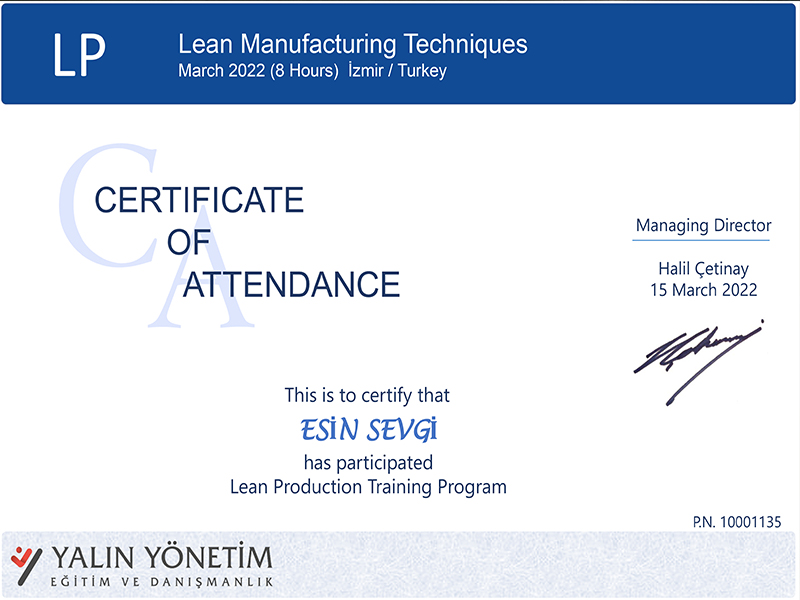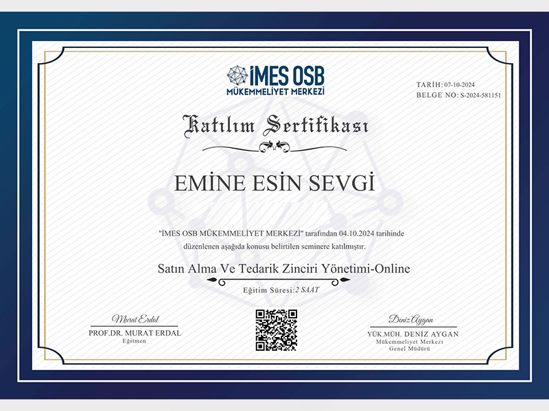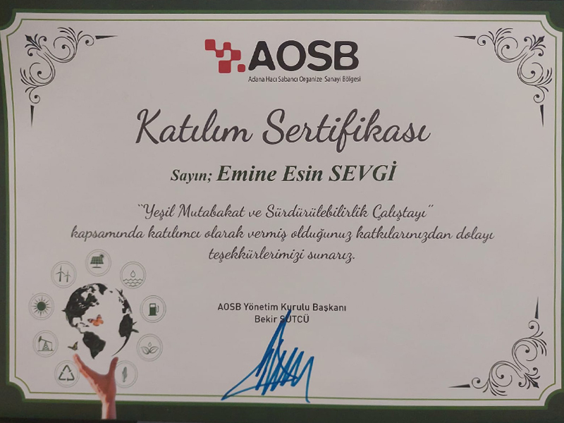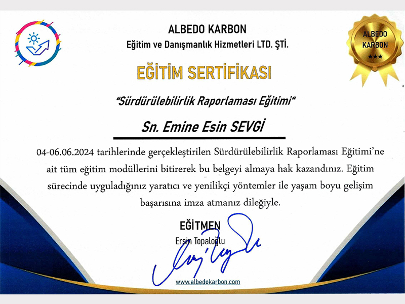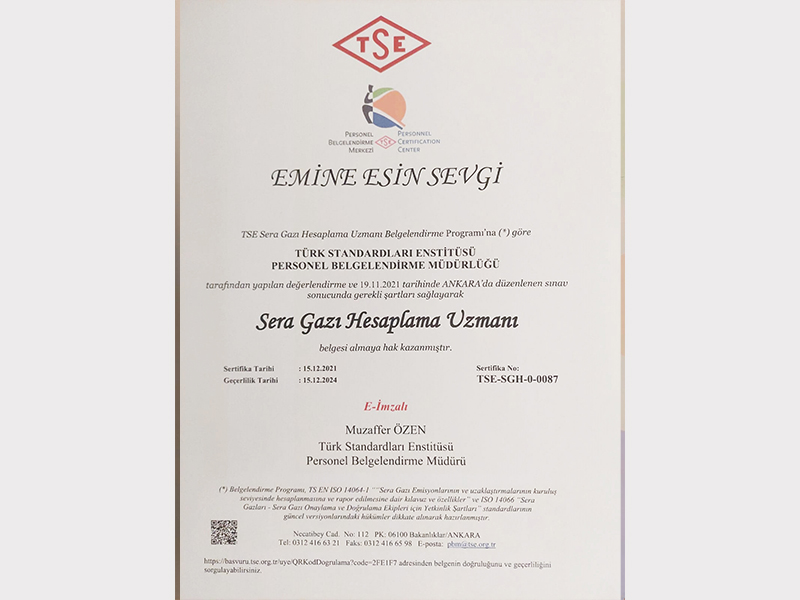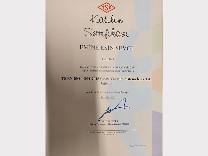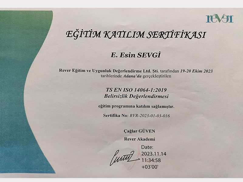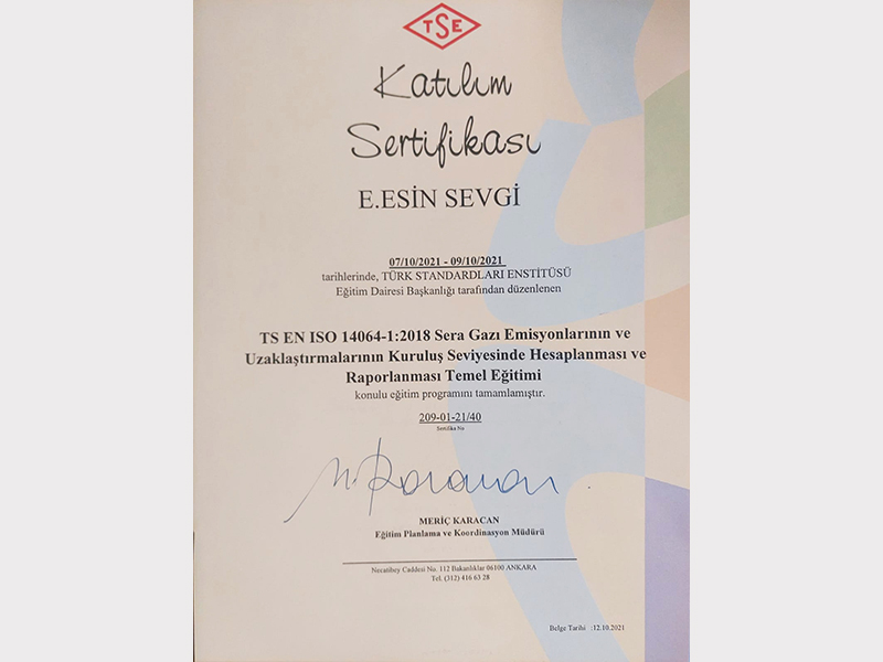 Çevreye duyarlı bir yaklaşım yalnızca uygulamalarla değil, aynı zamanda bilgi ve uzmanlıkla da pekiştirilir. Bu bilinçle, çevresel yönetim alanındaki uluslararası standartlar konusunda teorik ve pratik bilgi birikimimizi güçlendirdik. Ekibimiz, ISO 14064 ve ISO 14001 standartları kapsamında aldığı resmî eğitim sertifikalarıyla, çevresel sürdürülebilirlik konularında yetkinliğini belgelemiştir.